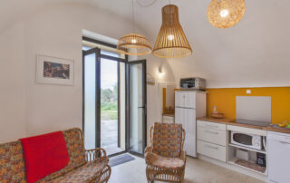 L’appartement que nous vous proposons de louer comprend 1 living avec cuisine intégrée, 1 chambre (1 lit), 1 salle d’eau (douche), 1 WC : il est parfait pour accueillir 2 personnes. Et si vous êtes plus nombreux, vous pourrez combiner ce T2 avec l’appartement du 1er étage qui permet de recevoir 5 personnes. Vous aurez ainsi les 2 niveaux de la maison à votre entière disposition, chaque niveau indépendant ayant son propre accès, le 1er étage par un escalier extérieur.